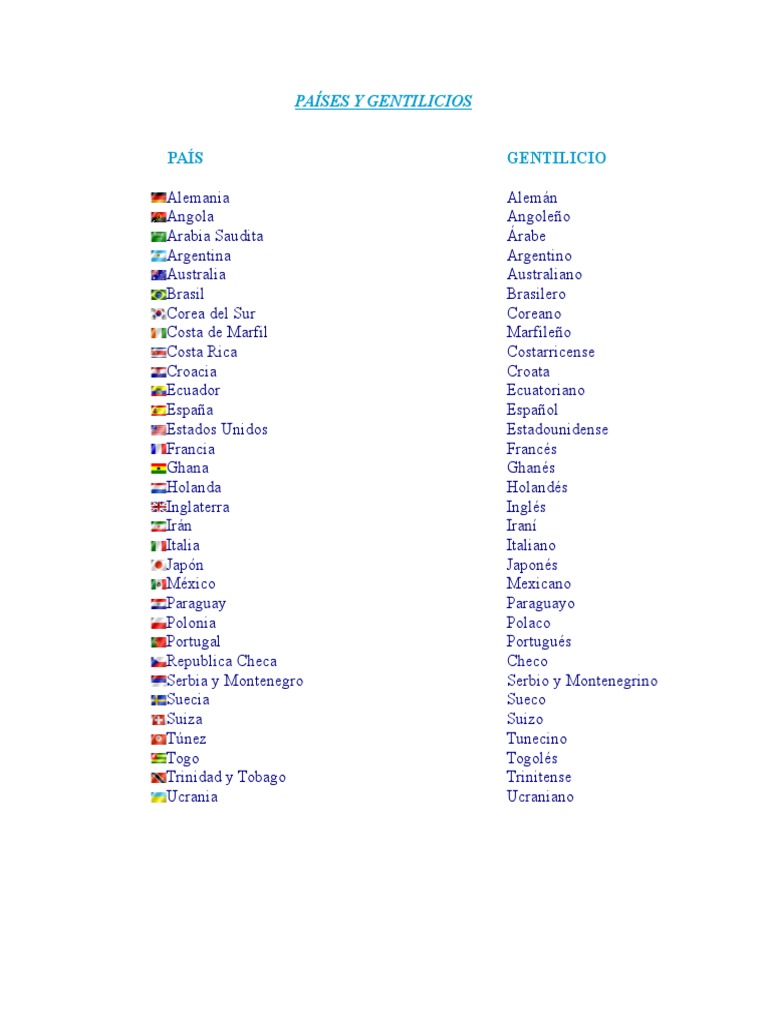 Los Paises Y Sus Gentilicios En Ingles